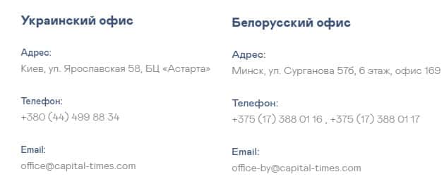 Самыми правдивыми данными являются контакты, которые аферюги Капитал Тайм разместили на своём веб-сайте. У них имеются офисы как в Украине, так и в Беларуси. В этих офисах, скорее всего, сидят ушлые звонари и менеджеры, выполняющие грязную работу для мошенников Capital Times. Контакты:
