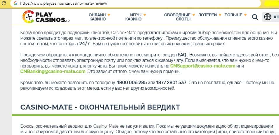 - Реальные отзывы со сторонних сайтов о подвальной деятельности Casino Mate