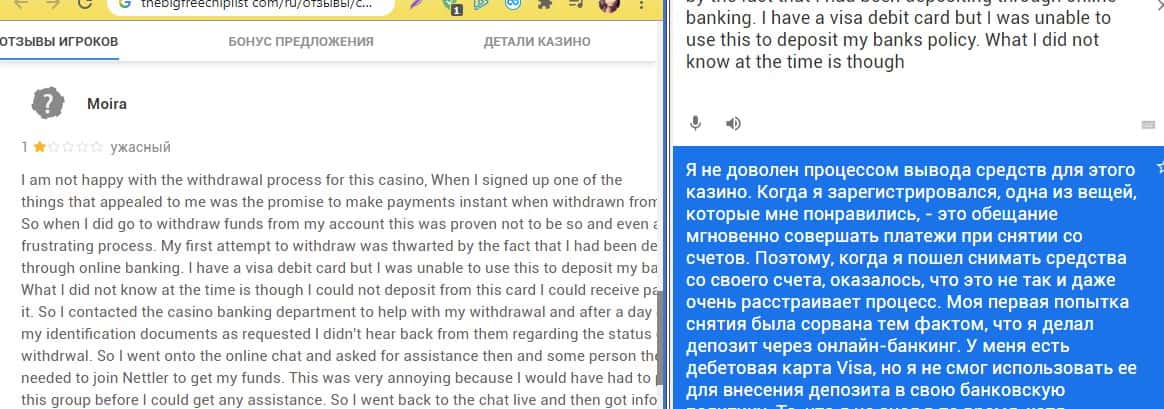 Далее можно увидеть еще один отзыв недовольного пользователя, в котором он рассказывает о всех недовольствах после работы с шарагой Casino Mate. Никаких мгновенных обещанных платежей от конторы клиент не получил.