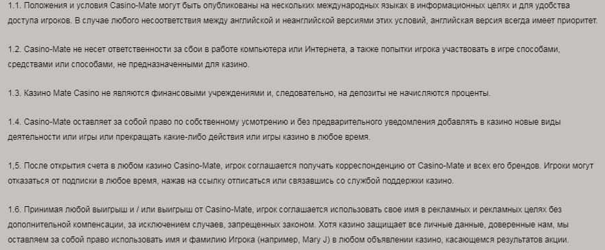 Еще дальше видно, что казино Casino Mate настойчиво оставляет за собой право в дальнейшем запросить требования или изменить условия сотрудничества, что довольно опасно для неопытных игроков.