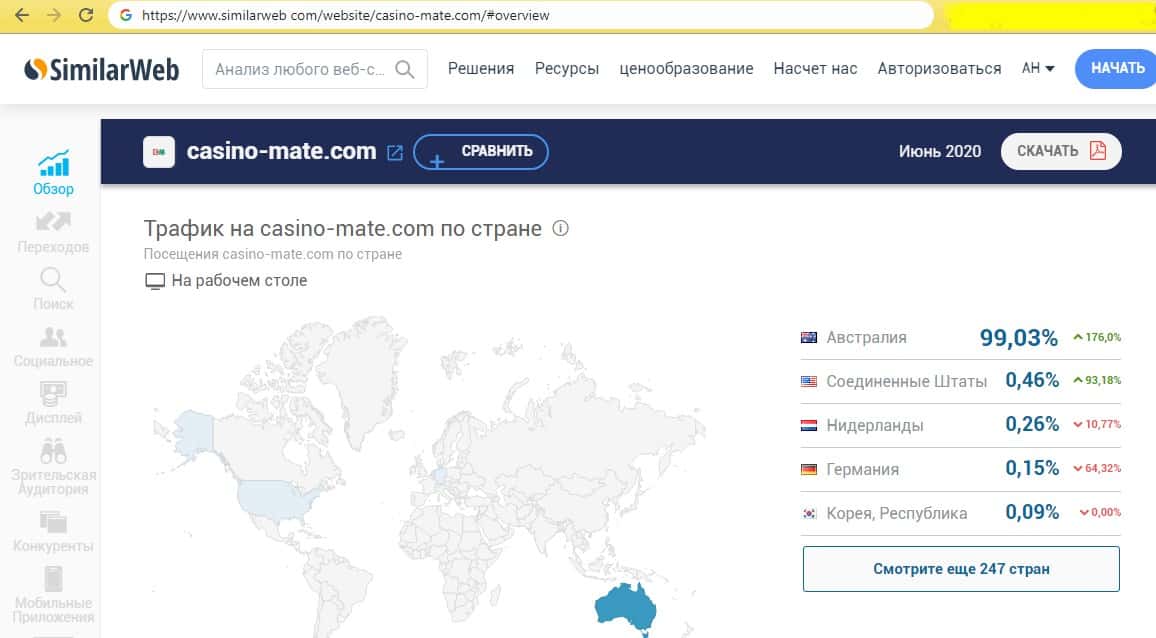 По статистике, данной сайтом симилярвеб ком видно, что основной трафик на посещение сайта шел по стране Австралии, а также небольшой процент США, что вызывает все больше подозрений.