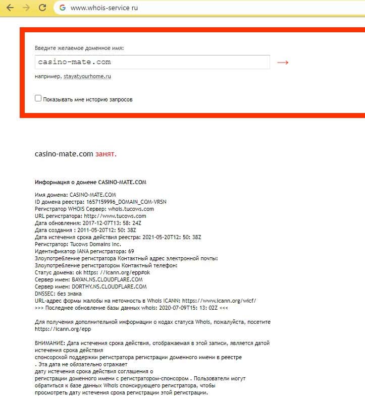 - Показатели сайта whois-service ru по домену мошенников Casino Mate