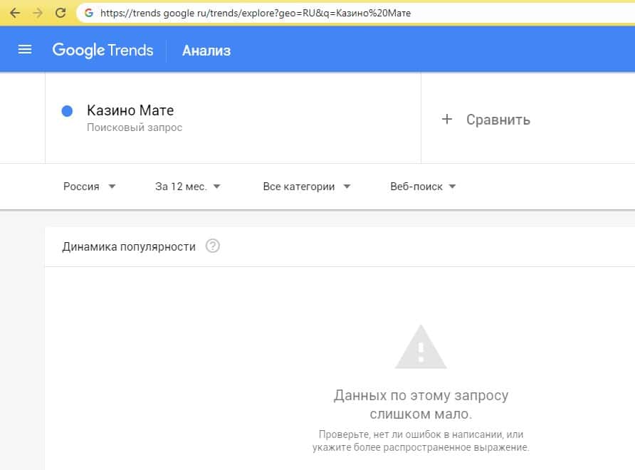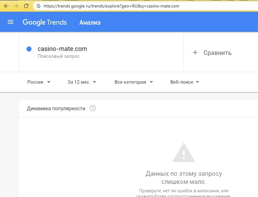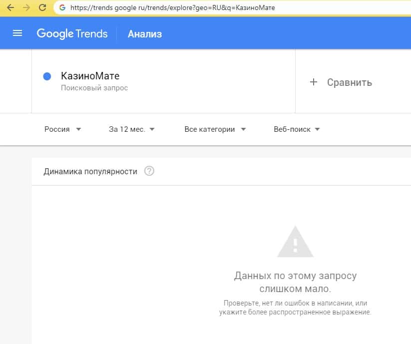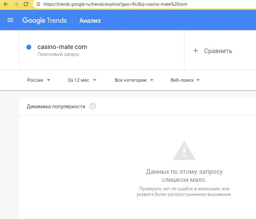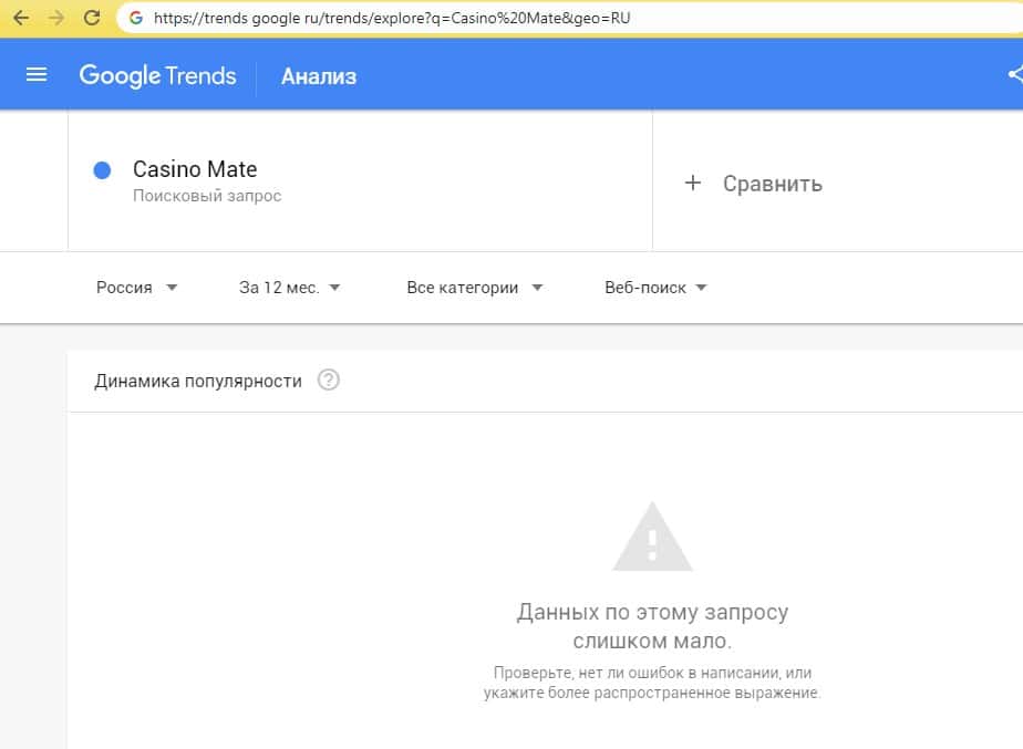 Еще один вариант поиска по домену "casino-mate.com" был проанализирован сайтом Гугл Трендс, но также неизменно о мошенническом казино ничего не известно и запросов не найдено.