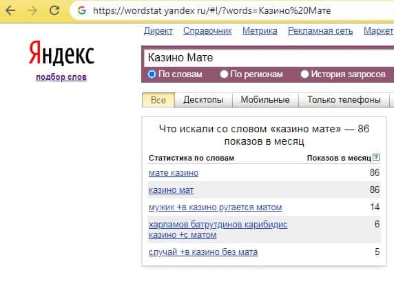 - Проверка количества запросов шараги Казино Мате по вордстату Гугл