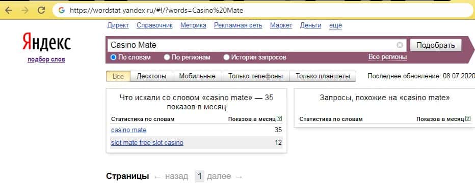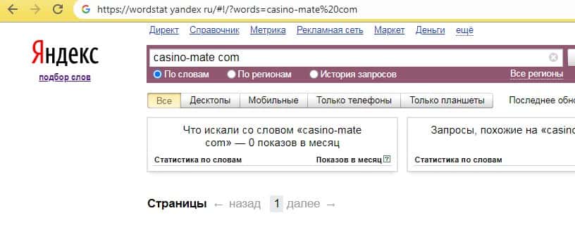 Далее проверяем запросы по домену с точкой "casino-mate.com" и получаем ноль результатов после анализа сайтом Вордстат Яндекс, что наталкивает на догадки о реальном мошенничестве.