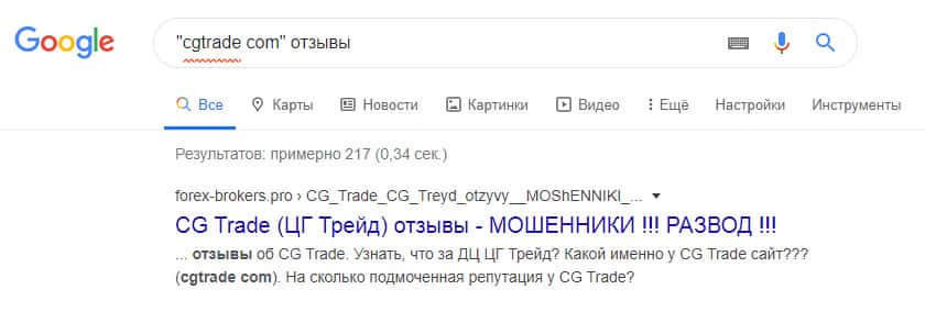 Как оказалось мошенники ЦГ Трейд так толком и не смогли привлечь пользователей сети интернет в свою помойку, в связи с чем аферисты CG Trade не пользуются никакой популярностью на просторах сети интернет и у обычных пользователей сети. На изображении ниже вы можете наглядно увидеть результаты поиска информации о шулерах.