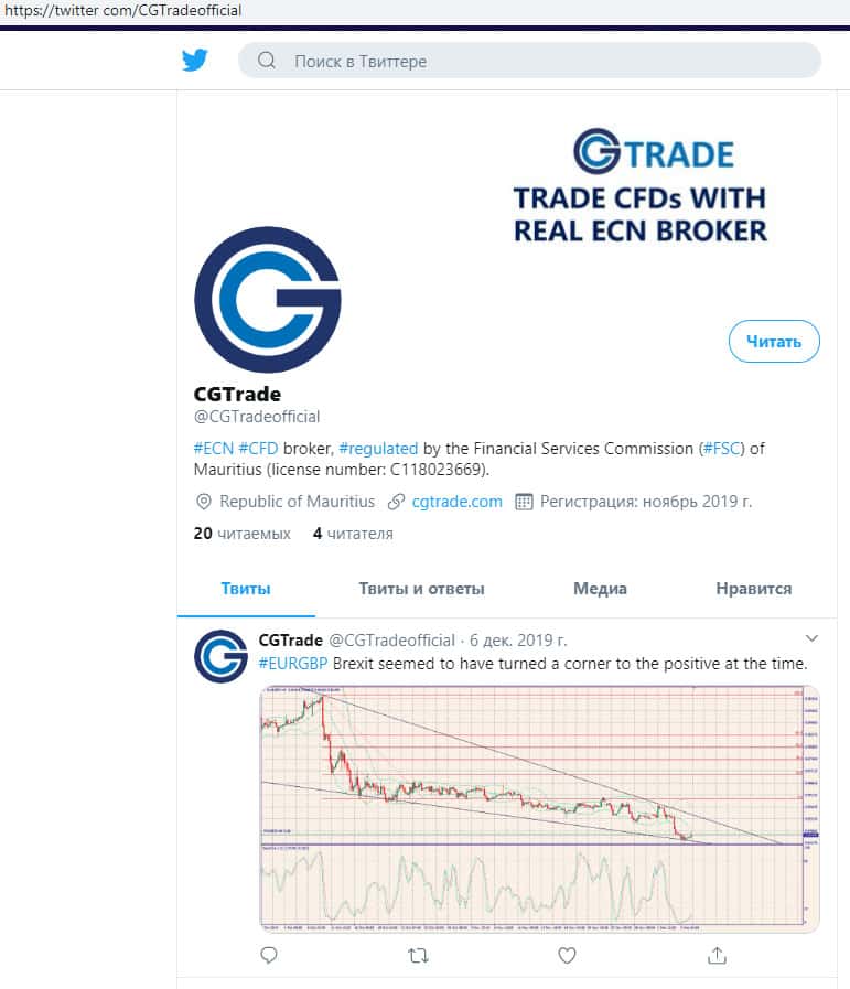 Аналогично обстоит ситуация у мошенников CG Trade и в социальной сети Твиттер, так как там аферисты ЦГ Трейд не пользуются особым успехом и имеют крайне мало подписчиков, что говорит о нежелании лохотрона CG Trade привлекать пользователей в свою контору, или же очередной халтуре проходимцев ЦГ Трейд. Итак ниже вы можете увидеть страницу шулеров в Twitter.