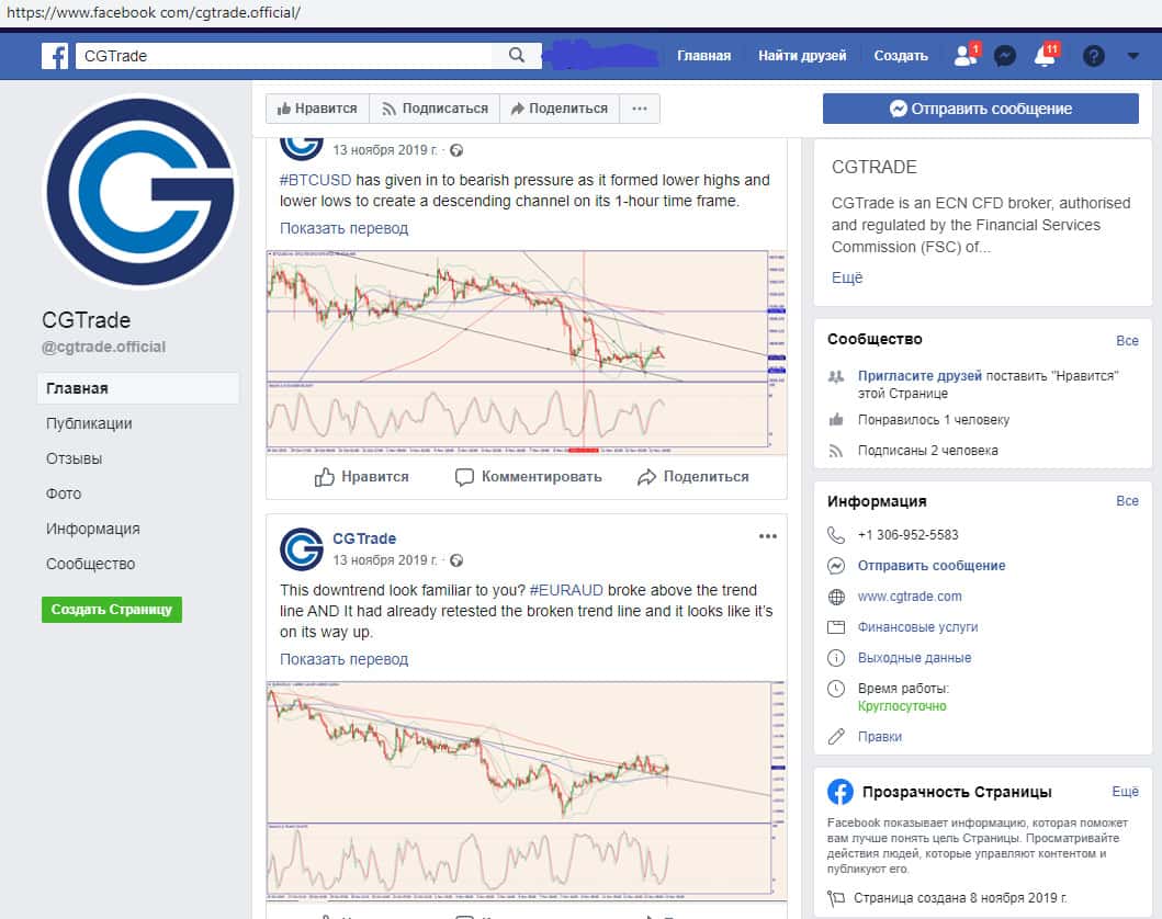 Дабы соответствовать современным трендам шулера CG Trade обзавелись страницами в социальных сетях одной из которых является Facebook, где у мошенников ЦГ Трейд толком не имеется подписчиков. На изображении, расположенном ниже, вы можете наглядно увидеть внешний вид страницы проходимцев CG Trade непосредственно в социальной сети Фейсбук.