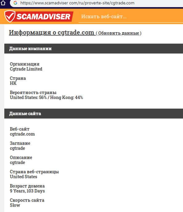 scamadviser com - сайт с технической информацией о лохотроне ЦГ Трейд