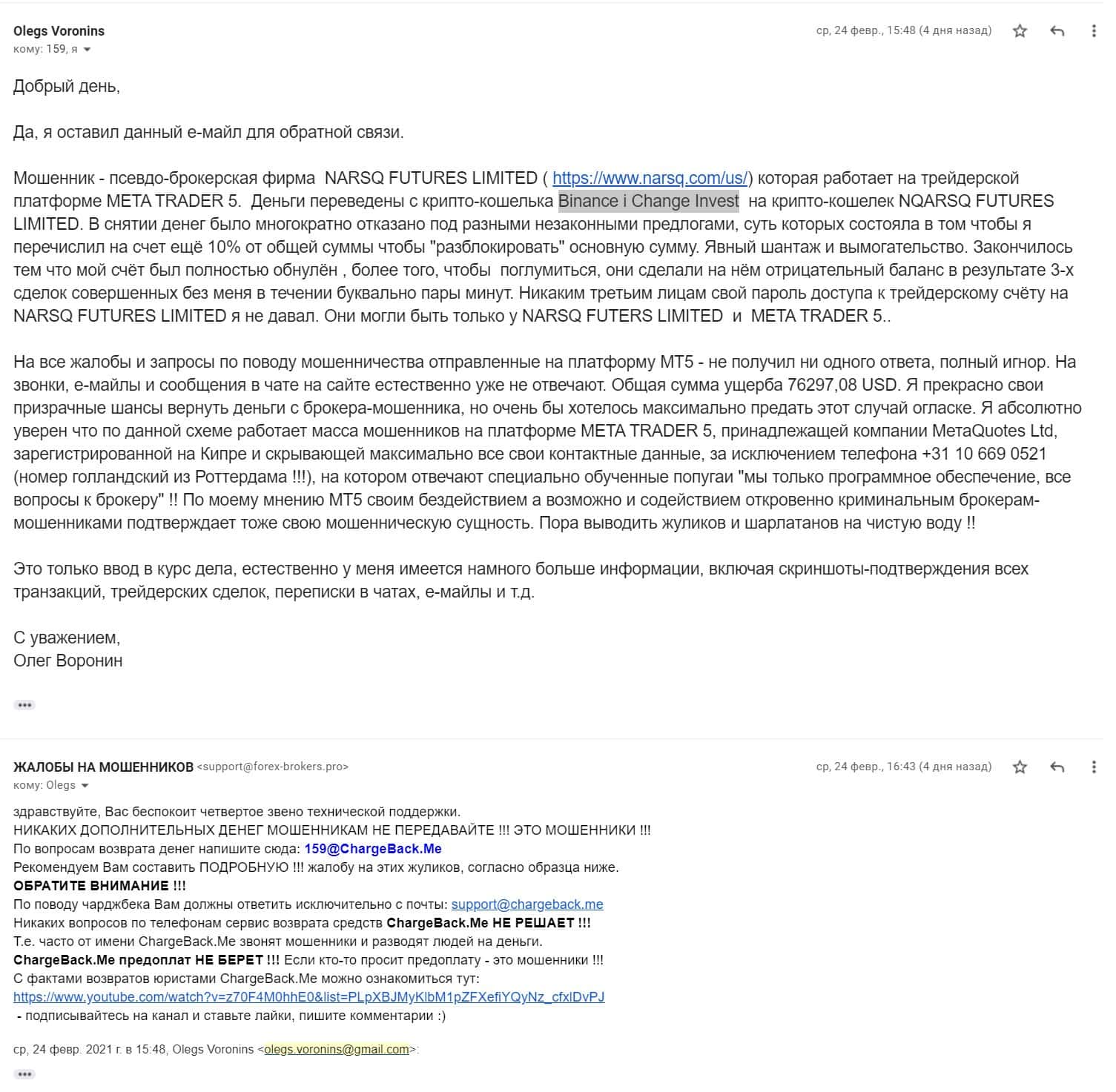 На почтовый адрес сайта по сбору информации о деятельности мошенников Форекс пришла жалоба на жуликов Change Invest, которые развели клиента совместно с Narsq и Binance.