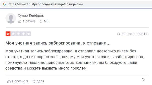 Пользователь указывает информацию о том, что лохотронщики Change Invest заблокировали его учетную запись без предупреждения и уведомления причин.