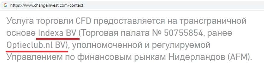 На сайте аферистов так же указано еще два юридических лица, а именно Indexa BV и Optieclub.nl BV, которые управляют интернет-лохотроном Change Invest.