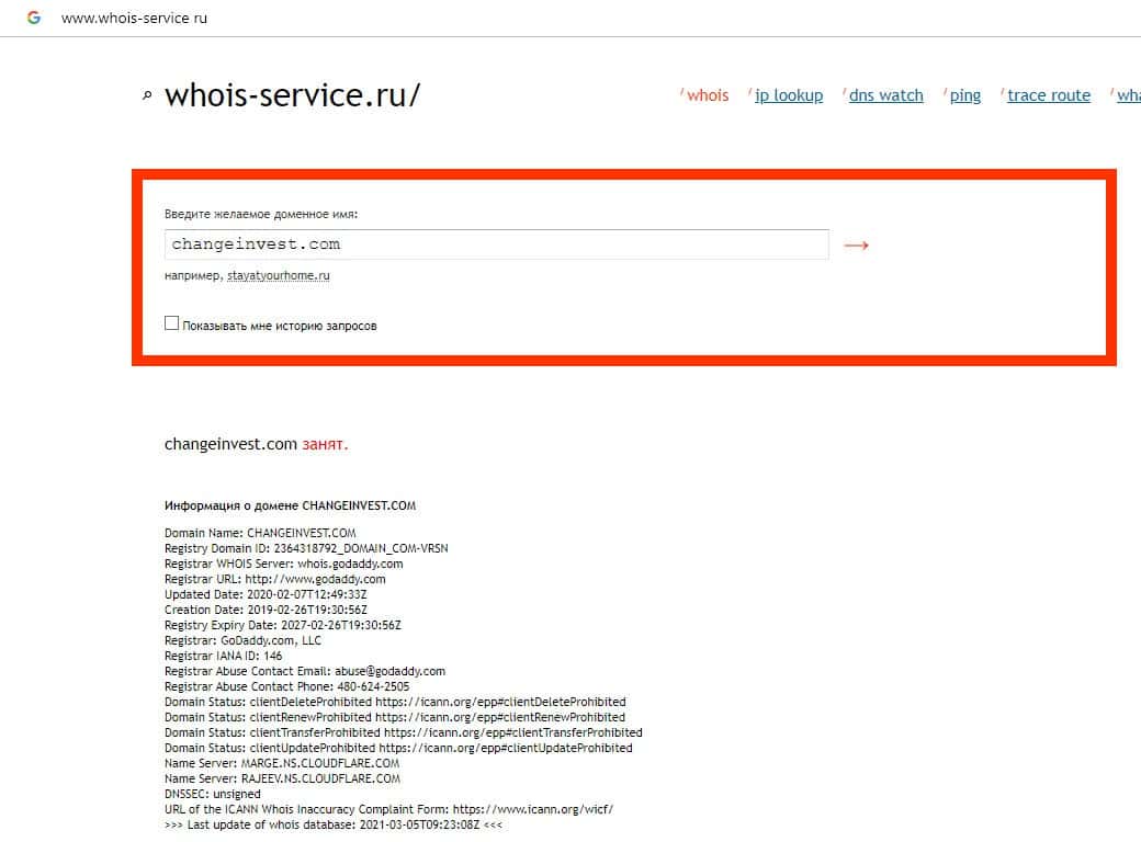 - Информация о возрасте домена скам-компании Чейндж Инвест