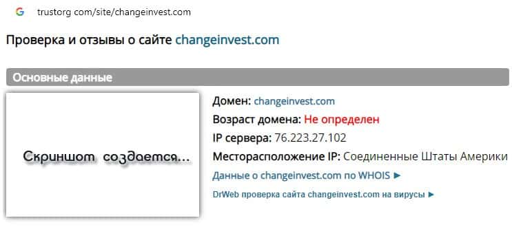 Проверка интернет-портала шулеров Change Invest на trustorg com показала, что возраст домена определить невозможно, мы имеем дело с очередной жульнической организацией.