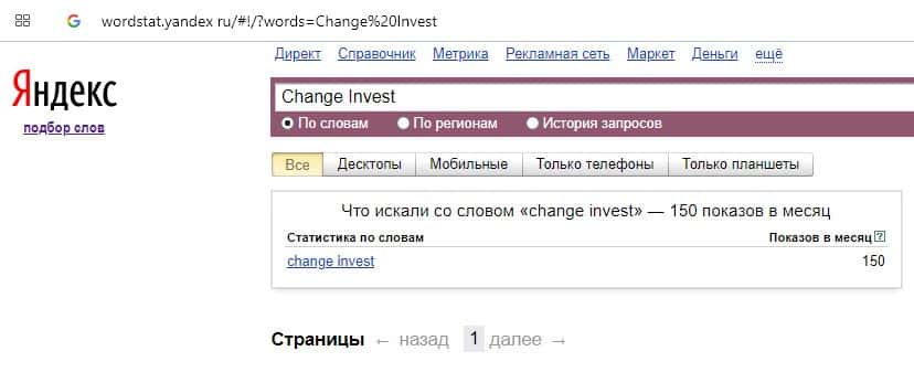 Количество брендовых запросов названия компании на английском языке "Change Invest" на Вордстарт Яндекс Ру составило 150 запросов за месяц.