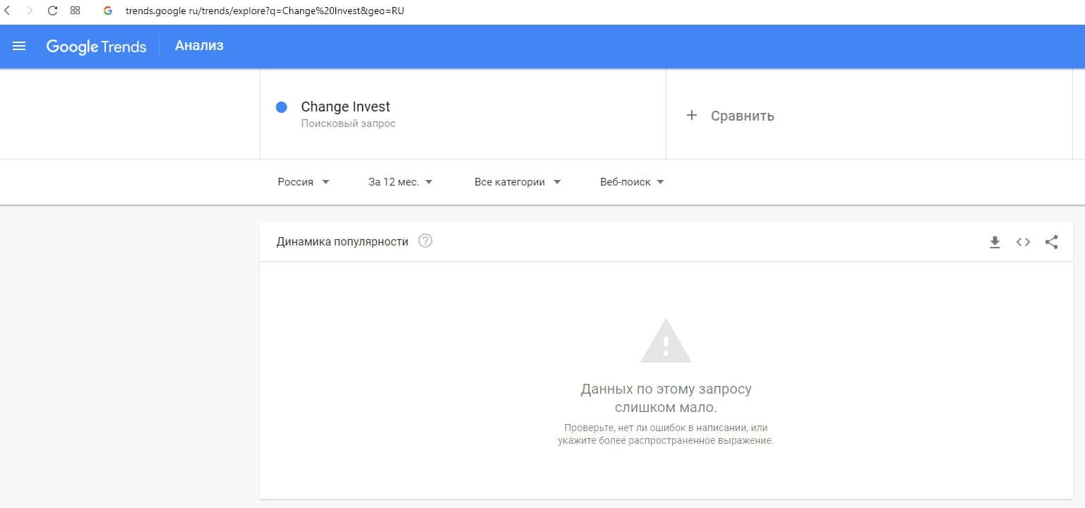 О количестве брендовых запросов названия компании на английском языке "Change Invest" на Трендс Гугл Ру информация отсутствует.