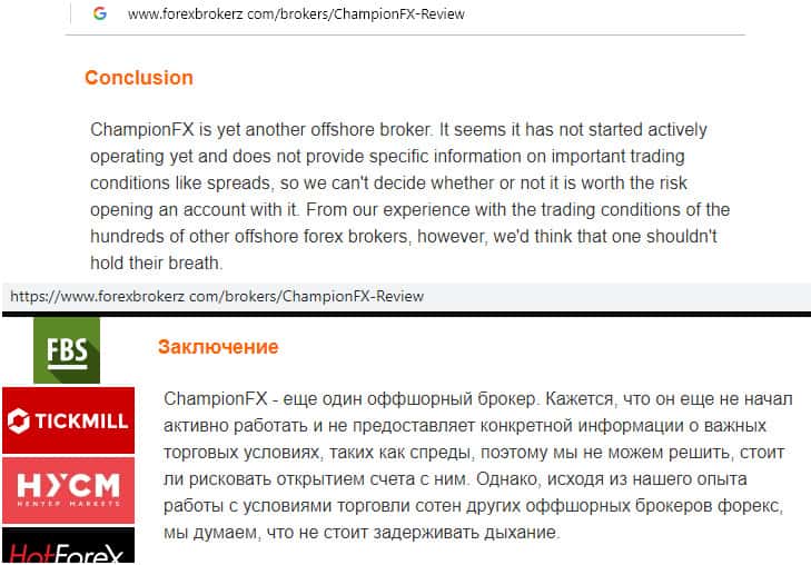 По мнению автора статьи на портале forexbrokerz com, лохотрон ChampionFX является оффшорным брокером, которых пруд-пруди в интернете. Он еще не начал активно работать, а уже есть куча жалоб, которые подтверждают, что это грязный брокер, созданный для обворовывания честных людей.