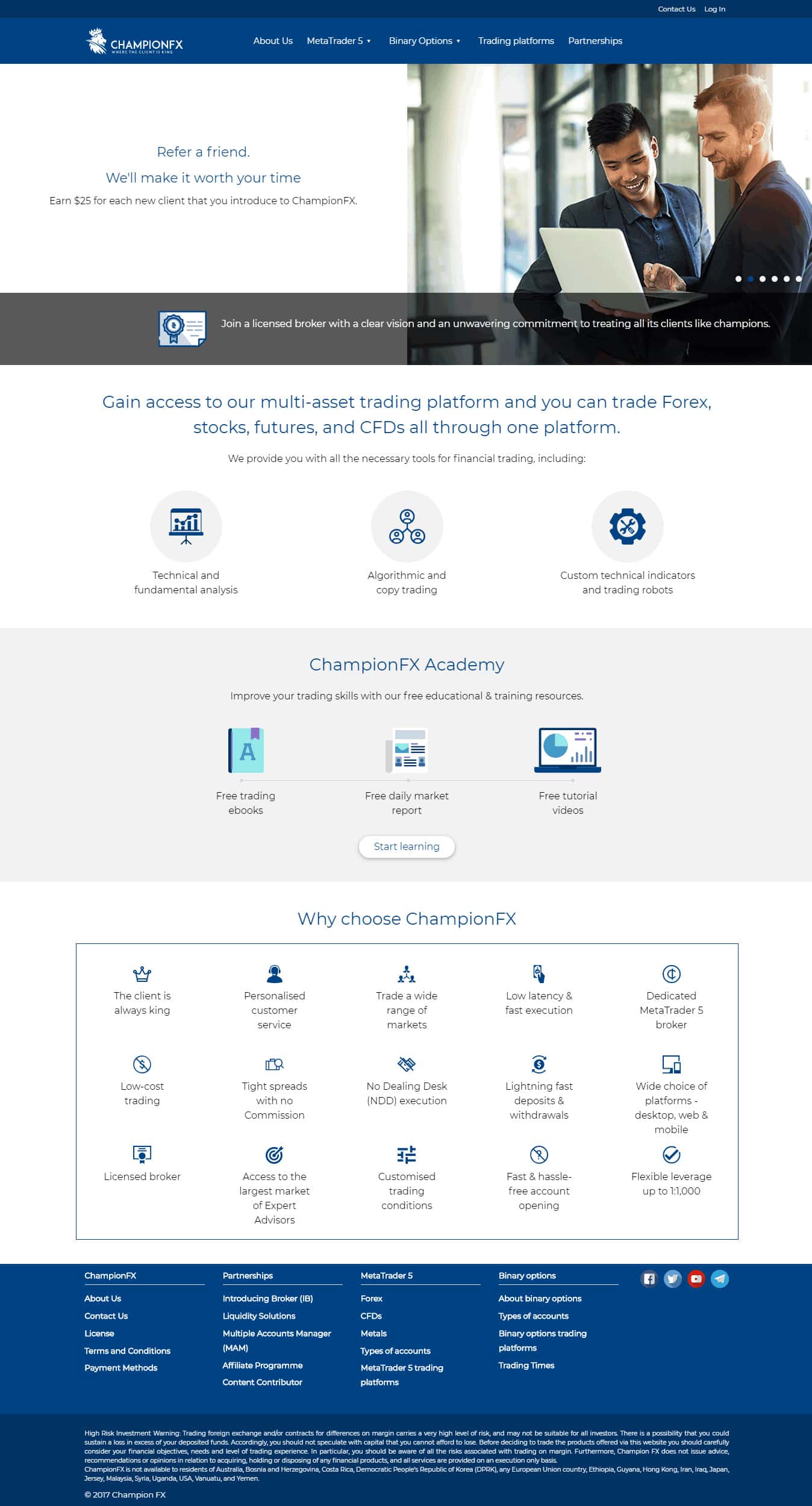 На сайте форекс-аферистов Чемпион ФХ вроде бы и есть какая-то информация, но нет никакой конкретики, касательно условий торговли. Еще одно не радует, что жулье предлагает использовать торговую платформу Мета Трейдер 5, которой пользуются 95% мошенников по всему миру. Так что лучше не рисковать и обходить их стороной.
