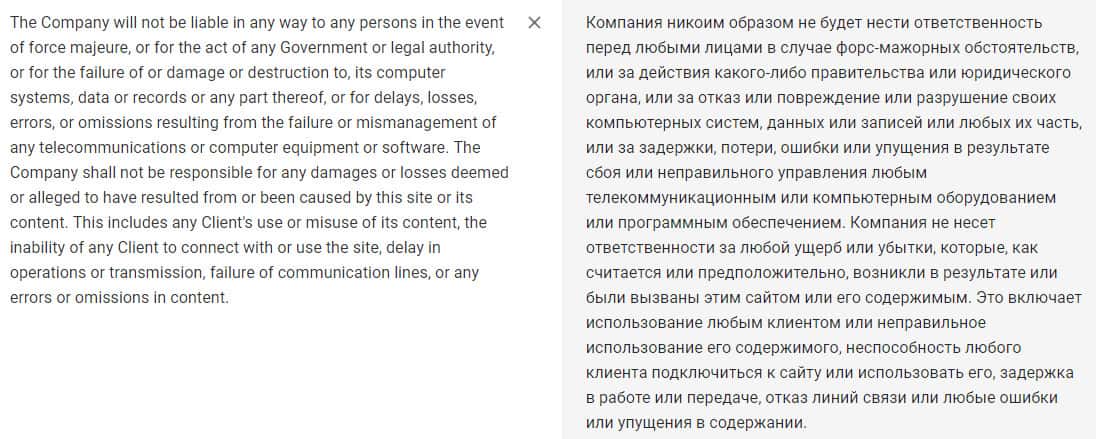 В клиентском соглашении все становится понятно, когда читаешь раздел ограничения ответственности. Жулики четко указывают, что контора Чемпион ФХ ни в коим случае не будет нести ответственность перед любыми лицами, в случае форс-мажорных обстоятельств. А вот что это за обстоятельства, так сюда можно по сути приписать все что угодно.
