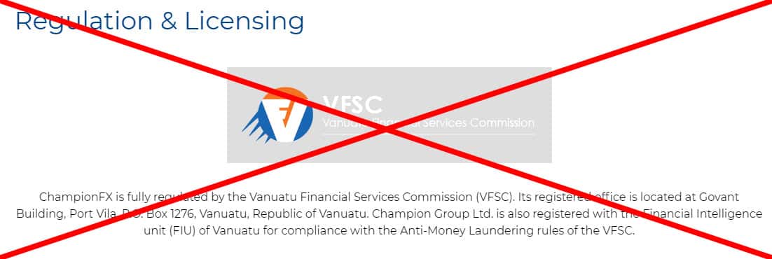 Касательно лицензии на деятельность мошеннической организации Чемпион ФХ, жулье предоставляет некоторую информацию, что они якобы регулируются Vanuatu Financial Services Commission, но как оказалось, никакого подтверждения того, что это правда нет вообще. Поэтому эти данные можно назвать фейком.