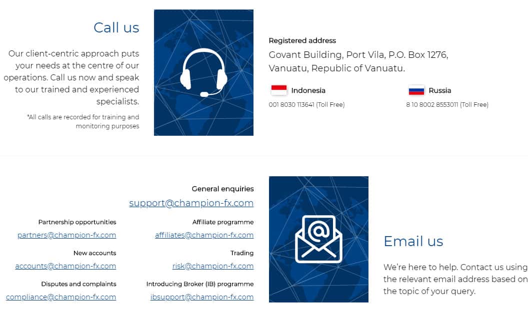 Чтобы уберечь себя от лишних разбирательств и несение ответственности перед клиентами и законом, аферисты Чемпион ФХ решили зарегистрировать свое предприятие в оффшоре, поэтому, если вас вдруг кинут там, то немедленно отправляйтесь по адресу: Govant Building, Port Vila, P.O. Box 1276, Vanuatu, Republic of Vanuatu.