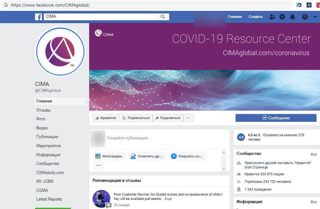 Поддельная финансовая контора СИМА Глобал проводит достаточно активную деятельность по продвижению своих услуг в социальных сетях, а особенно в Фейсбуке, так как количество ее подписчиков составляет 234723 человека. Но здесь не обошлось без купленных подписчиков и обыкновенных ботов. Адрес facebook com/CIMAglobal/