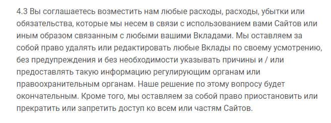 В пункте 4.3 соглашения сообщается о том, что проходимцы из иллюзорной финансовой конторы CIMA оставили за собой также право удалять или редактировать любые вклады по своему усмотрению, без предупреждения и без необходимости указывать причины. При том, это решение является окончательным, что идет в разрез с интересами и права трейдеров.