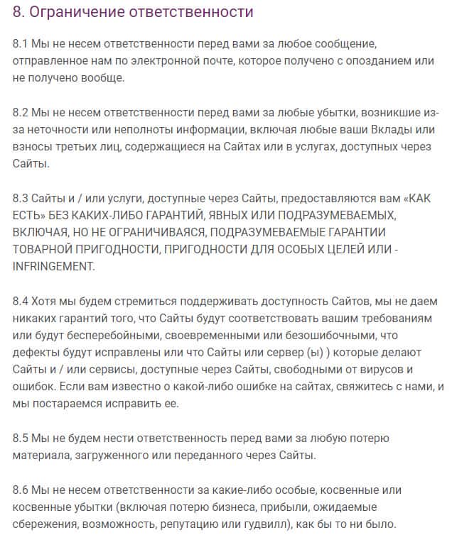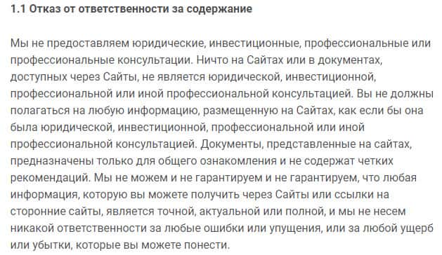 Начнем с пункта 1.1 Отказ от ответственности за содержание, в котором говорится прямым текстом, что махинаторы из фиктивной финансовой компании не несут никакой ответственности за любые ошибки или упущения, или за любой ущерб или убытки, которые клиент может в будущем понести. В итоге, зачем связываться с шарагой, которая не хочет отвечать ни за что.