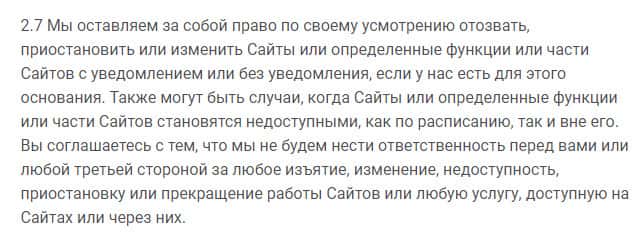 В пункте 2.7 договора идет речь о том, что мошенники из поддельного регулятора CIMA оставили за собой право по своему усмотрению отозвать, приостановить или изменить сайт даже без предварительного уведомления форекс игроков об этом. Очередной доказательство того, что необходимо держаться подальше от жуликов СИМА Глобал.