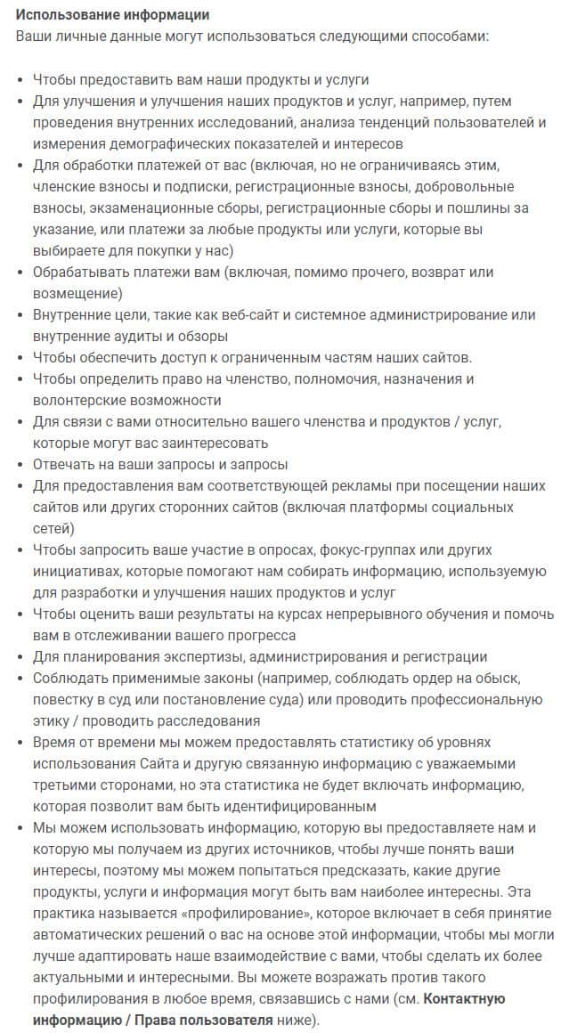 В следующем разделе "Использование информации" говорится о том, что мошенники дилинговой конторы CIMA могут использовать личные данные своих клиентов в различных целях: начиная от предоставления услуг и заканчивая оцениванием обучения на сайте. Но мы-то знаем, что зачастую это делается ради собственной выгоды во вред наивным трейдерам.
