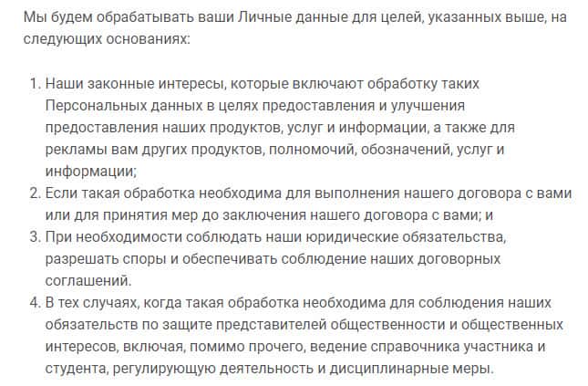 Далее идет речь о том, что мошенники из фиктивной финансовой конторы CIMA могут обрабатывать личные данные форекс игроков на основаниях, указанных на нижнем скриншоте. Все четыре пункта, на первый взгляд, выглядят вполне правдоподобно и даже придерживаясь основных юридических тонкостей. Но на самом деле, это просто для отвода глаз.