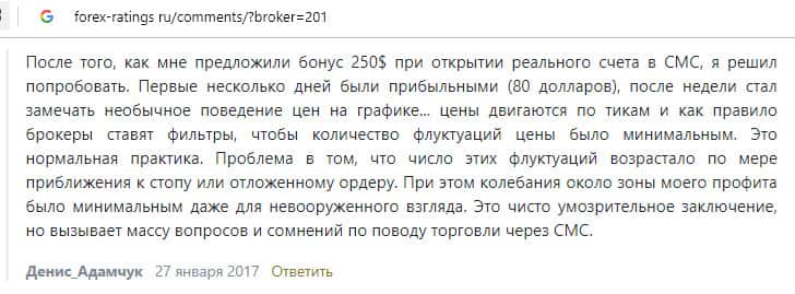По мнению еще одного пользователя сети, брокерская контора СМС Маркетс занимается обыкновенными махинациями с ценами. При чем делается это довольно открыто и все можно проверить самому. Когда начинаешь предъявлять претензии в техническую поддержку, то там моментально бросают трубку.