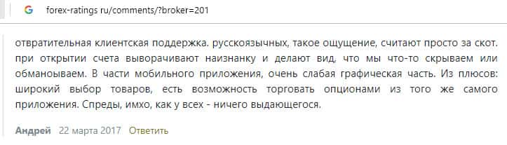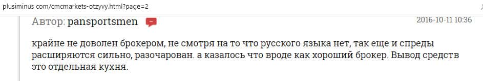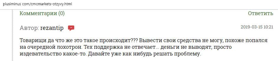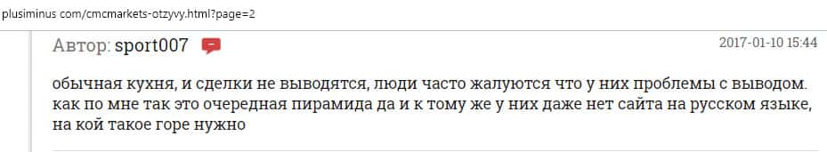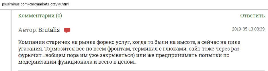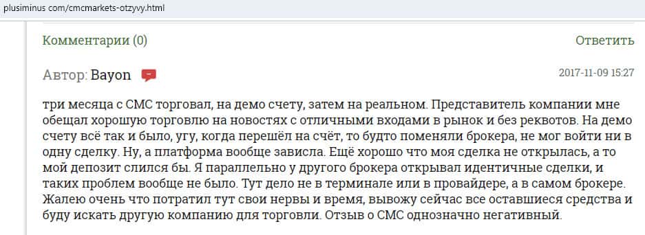 В следующем отзыве человек жалуется, что не было ни одного дня, когда в торговле не происходил какой-то сбой и из-за этого все деньги просто сливались. В службе поддержки конторы CMC Markets списывают все на сбои в интернет-соединении и просто пытаются данный вопрос замять.