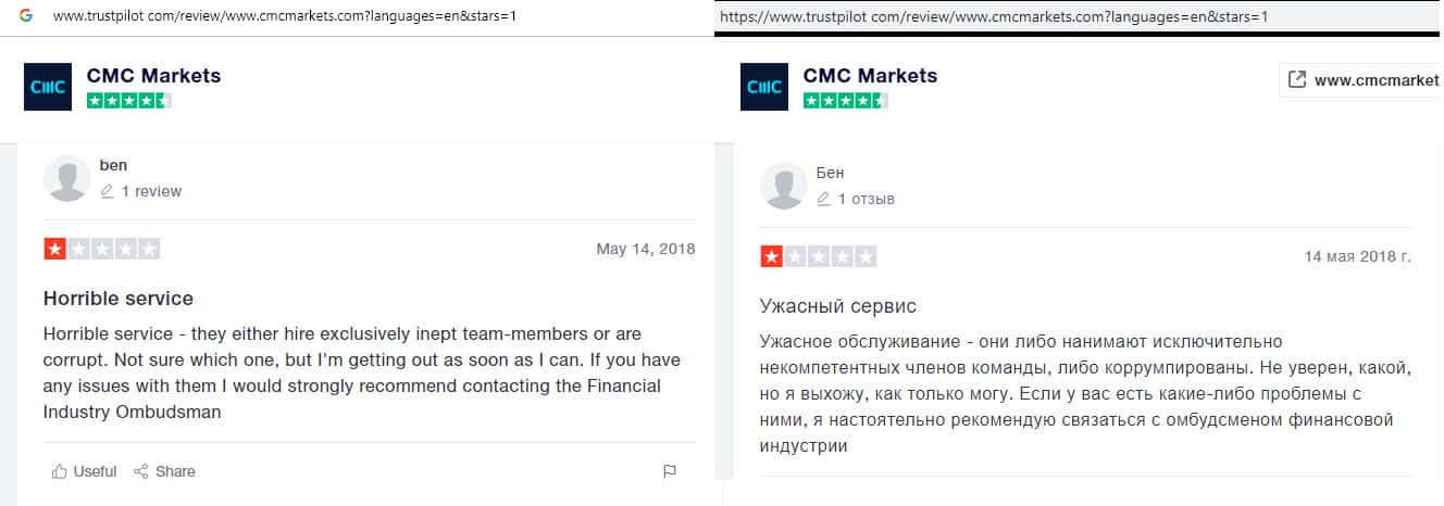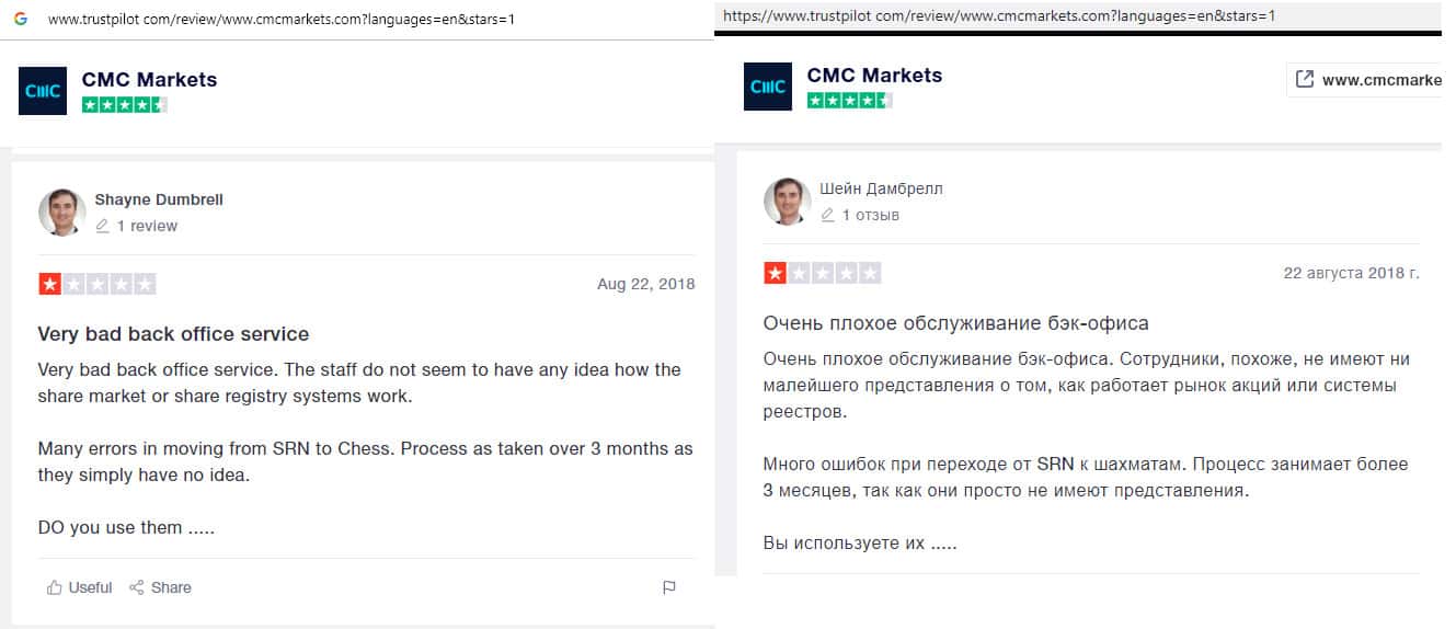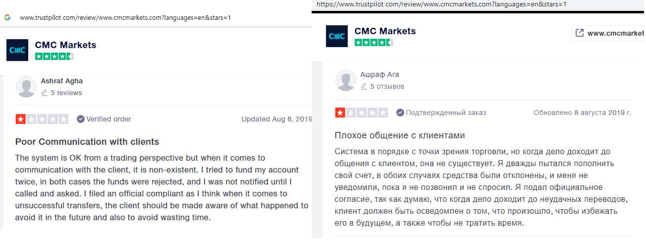 По мнению еще одного человека, который хотел стать клиентом конторы CMC Markets, у них очень плохое обслуживание, так как сотрудники не имеют ни малейшего представления о том, как работает рынок акций или системы реестра аккаунта. Иногда даже процесс пополнения счета затягивается до 3-х месяцев.
