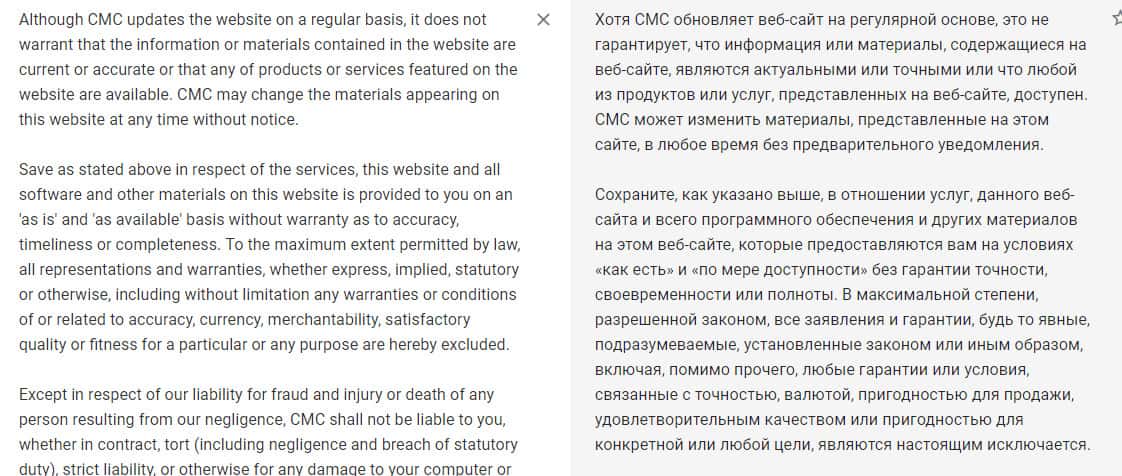 В клиентском соглашении брокерской конторы СМС Маркетс, также нет никакой гарантии, что они будут за что-то отвечать. Хватает только того, что даже сам веб-сайт, вернее то что написано там, может не соответствовать реальности и они не гарантируют, что указанная информация достоверна.