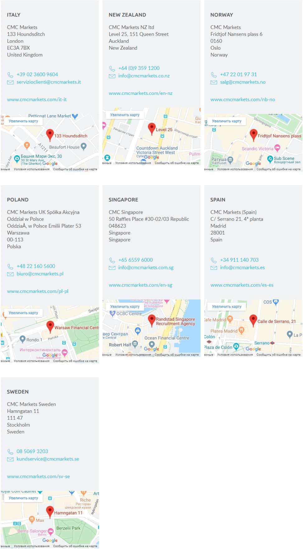 Для связи с собой, мошенническая контора CMC Markets придумала множество адресов, чтобы жертва, которую кинули не понимал к кому ему обращаться и предъявлять претензии. Также они указали номер телефона и электронную почту для тех, кто еще не успел перевести им деньги. Далее излагаем все контакты в подробностях:
