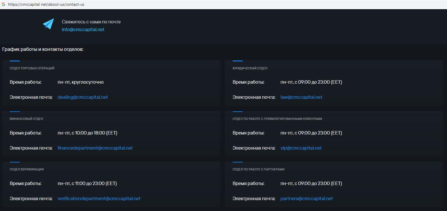 Аферисты CMCCapital Net на своем официальном интернет-ресурсе указывают целый список адресов электронной почты, а именно: