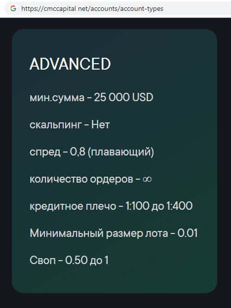 Во втором типе торгового счета мошеннической организации CMCCapital Net под названием Advanced минимальный депозит составляет 25 тысяч долларов.