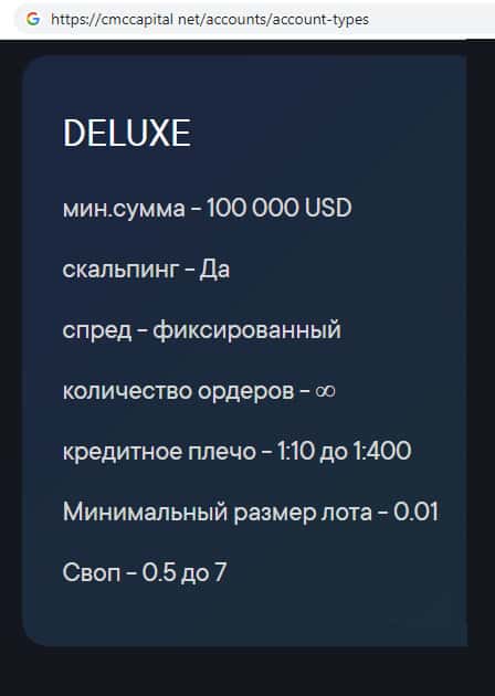 Жулики CMCCapital Net предлагают тип торгового счета Deluxe, где минимальная сумма депозита говорит о том, что перед нами очередная банальная форекс кухня.