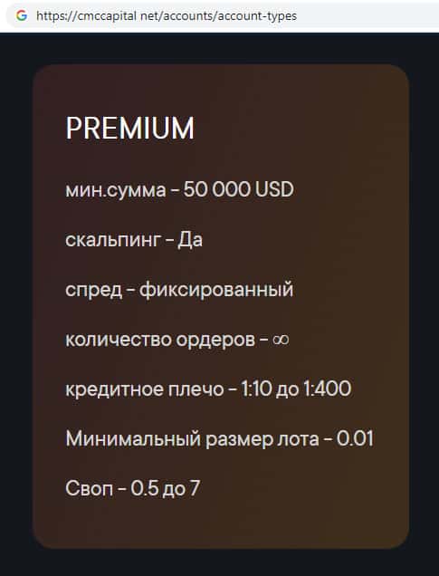 Также аферисты СМС Капитал предлагают тип торгового счета Premium, где минимальная сумма пополнения депозита составляет 50 тысяч долларов.