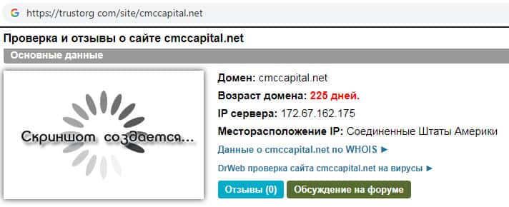 Проверка интернет-сервиса аферистов CMCCapital Net на trustorg com показала, что возраст домена к моменту написания статьи составляет 225 дней.