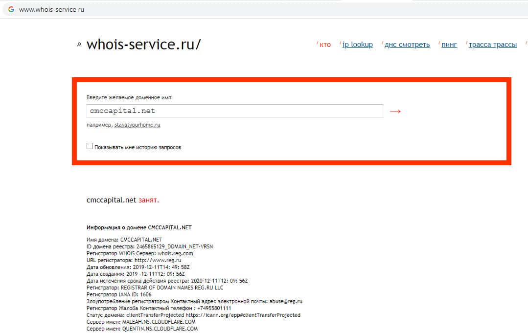 Сервис whois-service ru не может найти данные о владельце домена сайта данной мошеннической организации, доверять сайту скам-конторы CMCCapital Net нельзя.