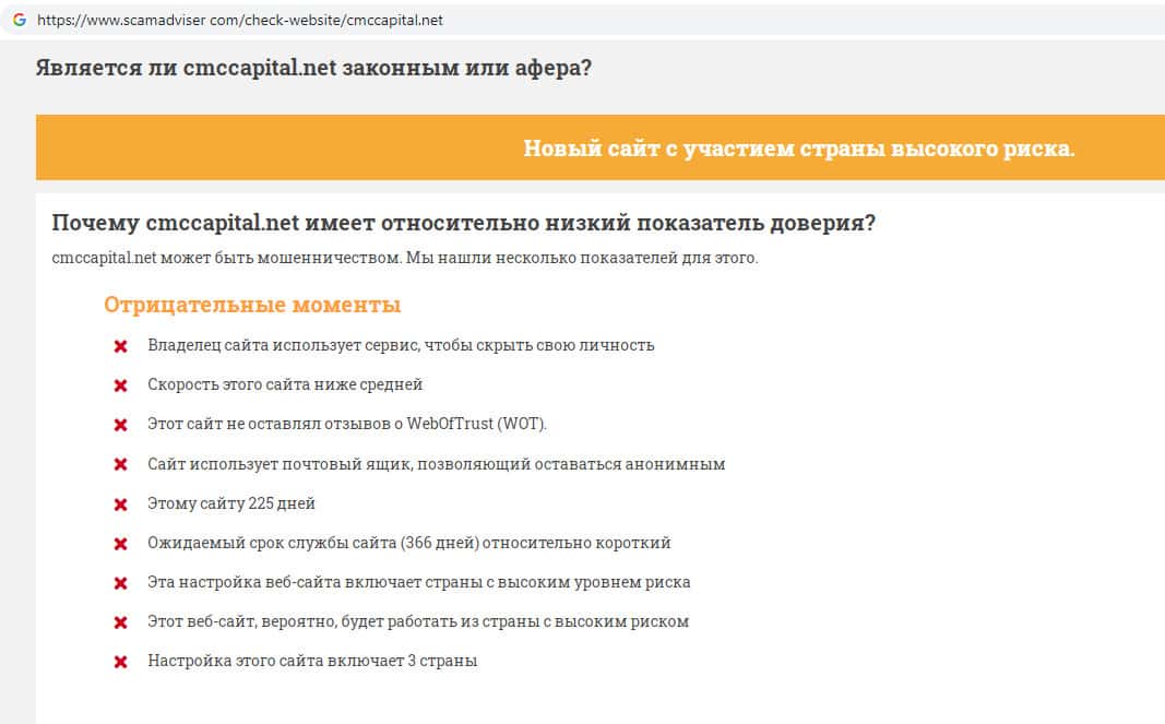 - Информация о надежности сайта CMCCapital Net на scamadviser com