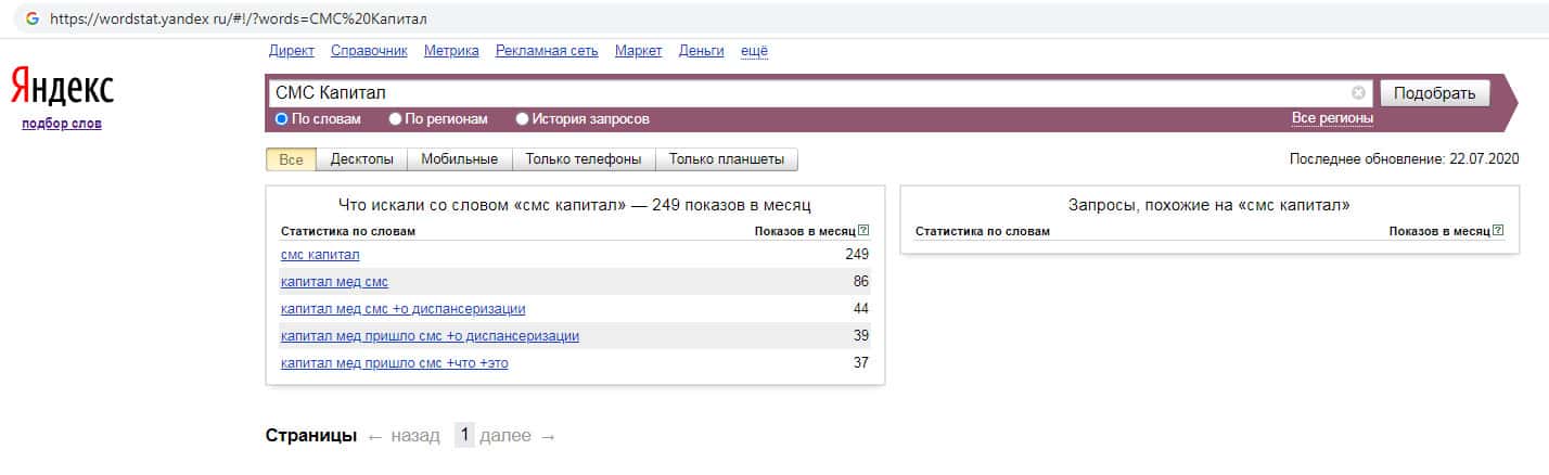 Количество запросов по бренду названия компании на русском языке без пробела "СМСКапитал" в поисковике Яндекс составляет 37 запросов за месяц.