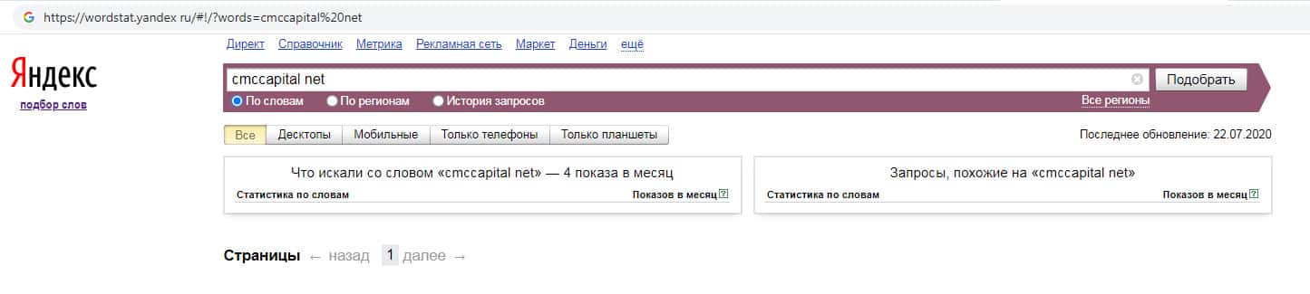 Количество запросов по бренду CMCCapital Net в поисковике Яндекс