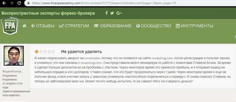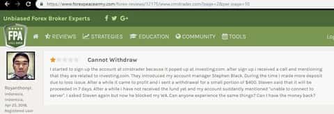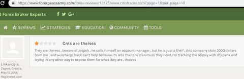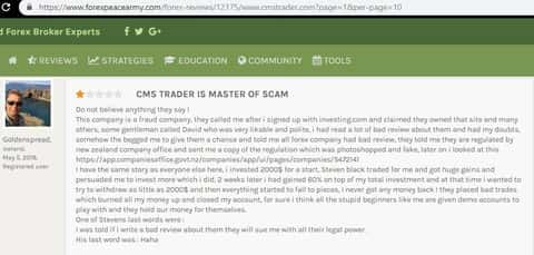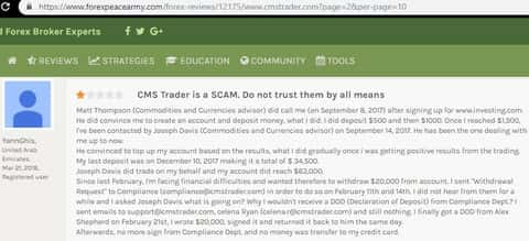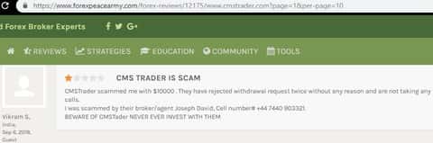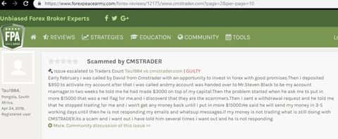 Новая жертва обмана попал на сайт CMSTrader через информационный ресурс investing com, прошел регистрацию и ему позвонил менеджер-звонарь Стивен Блэк, который помогал совершать сделки, но так помогал, что клиент чаще пополнял счет чем зарабатывал. В итоге получилось немного выйти в плюс и решил вывести деньги. Стивен сообщил что вывод проведут в течении недели, но не сказал какой. Жертва обмана начал звонить менеджеру, но тот заблокировал его аккаунты и звонки.