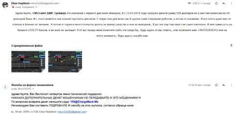 Клиент открыл счет в брокерской конторе ЦМС Трейдер и решил попробовать свои силы на Форекс-рынке. Однажды он зашел на свой аккаунт, на который уже успел положить 7000 долларов, и увидел что кто-то открыл сделку на все. Он начал звонить своему менеджеру по имени Хани, но тот не отвечал. Человек решил дозвониться хитростью и назвался новым клиентом, на что сразу ответили и жертва обмана рассказал все. Но уже было поздно и сумма на счету поредела на 6517 долларов. Он написал письмо своему менеджеру с просьбой о разъяснении и в ответ позвонил Мохаммад Абдулла, который сообщил что ведется расследование по этому поводу. Но никто больше не отвечал и клиент, поискав информацию о мошенниках понял, что его развели и он не первый такой.