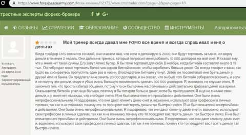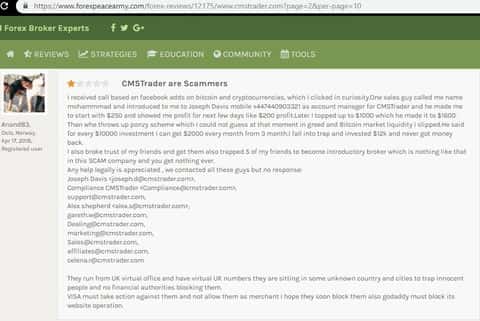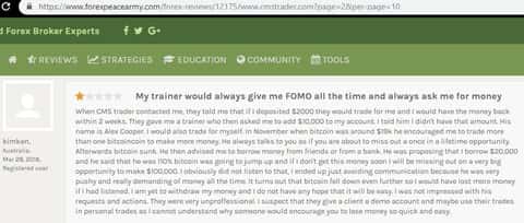 Клиенту позвонил аферист дилинговой кухни ЦМС Трейдер и посоветовал вложить 2000 долларов, чтобы через несколько недель удвоить свой депозит. После перевода средств, уже другой менеджер по имени Алекс Купер начал вымогать вложить 10 000 долларов, так как можно будет отлично заработать. Но клиент упирался, хотя звонарь давил на него и вымогал уже вложить и 20 000 долларов. Человек сказал, что у него нет таких денег, на что аферист заставлял идти в банк за кредитом или занимать у друзей. Теперь жертва обмана опасается общения с ними из-за их не профессионализма.