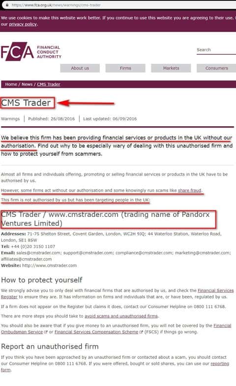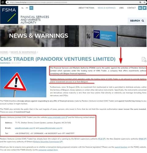 Согласно следующему бельгийскому регулятору Органу по финансовым услугам и рынкам брокерская контора CMSTrader контора работает тоже нелегально. FSMA предупреждает общественность о деятельности Pandorx Ventures Limited, которая работает под торговым названием CMSTrader, компании, предлагающей инвестиции без соблюдения бельгийского финансового законодательства.