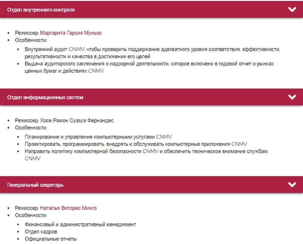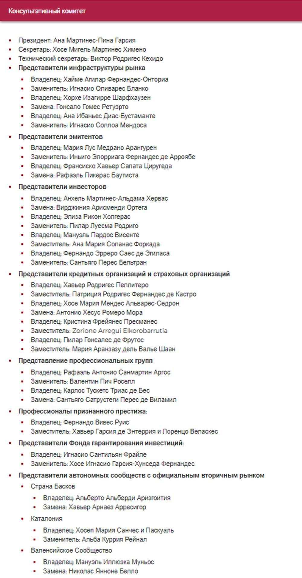 Если просмотреть структуру, кажется, что у шарашки The Comision Nacional del Mercado de Valores куча комитетов и каждый отвечает за свое направление. С одной стороны хорошо, так контора будет выполнять свои обязательства лучше... А нет, показалось. Сидят в комитетах одни и те же лица, то есть, это очередной обман. Руководство мошенников: